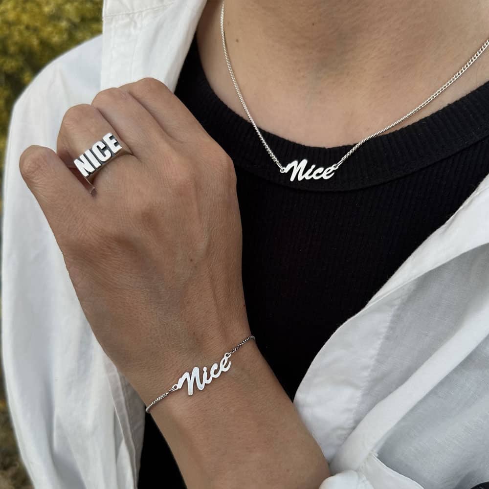 > The word "Nice" available in sterling silver and 14 karat gold.