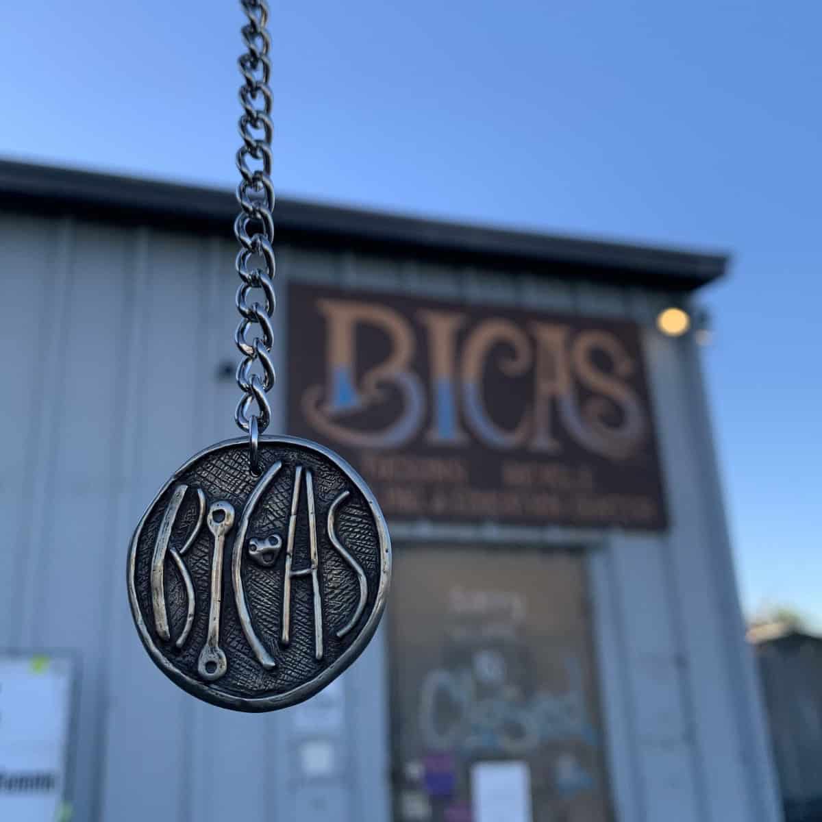 It all began my first visit to the original shop, when I spotted the word “BICAS” spelled out in pressed bike parts on the asphalt outside their original Citizens Warehouse location. That gritty, brilliant artwork captured their entire spirit—DIY, inclusive, artistic, grounded, zero-waste, and community-powered. When I heard they were moving, I knew I had to honor it and capture the image in a jewelry design.