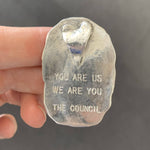 One day, doodling on a zoom call with The Council, I realized the word COUNCIL could form a fingerprint, I had to create it. This idea rang all my bells. I’ve always loved hidden messages in jewelry, and this fingerprint-swirled design was a challenge and a joy to create. The second idea to add a "pressed-into-clay" version with Morse Code prompted me to purchase my first ounce of silver clay in nearly a decade. That was fun and memory lane!