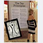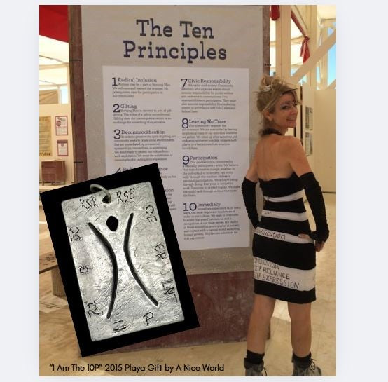 I Am The 10 Principles - This Playa Jewelry design celebrates - and helps us recall - each of the 10 Principles we live by at Burning Man. The Principles are captured as acronyms on one side of this bold rectangular pendant. The "see through to you" cut-out of the Man is intentional, to reveal the wearer from within the piece.